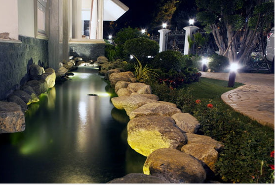 - Sử dụng để trang trí cho các tiểu cảnh sân vườn như thác nước, hòn non bộ, vườn đá… hoặc đặt xung quanh các bồn hoa, chậu cây cảnh, tượng đài để tạo điểm nhấn và làm nổi bật vẻ đẹp của các cảnh quan này vào ban đêm. Sự kết hợp giữa cây xanh và ánh sáng ấm áp từ đèn tạo nên một bức tranh sân vườn sống động, hài hòa và mang lại một không gian thư giãn đầy chất thơ.