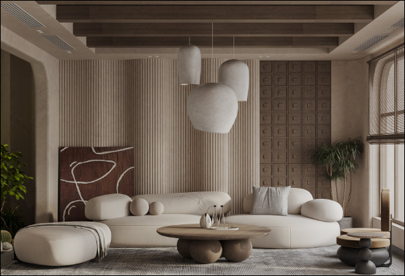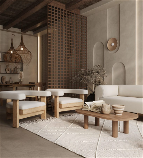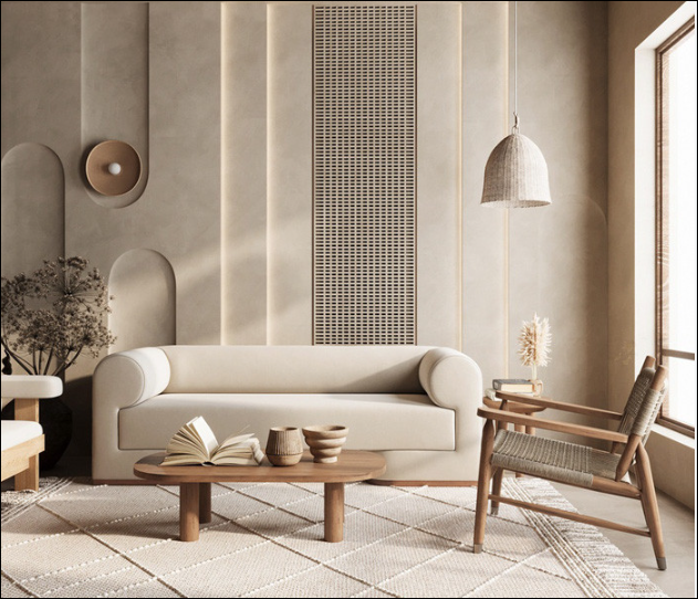 Thiết kế tối giản, mộc mạc dạng trụ cao; sử dụng vật liệu tự nhiên và có ánh sáng dịu nhẹ, mang lại cảm giác bình yên, thư thái. Các chi tiết thường có nét đẹp “không hoàn hảo” và dấu ấn thời gian, với màu sắc trầm ấm và không quá phô trương.