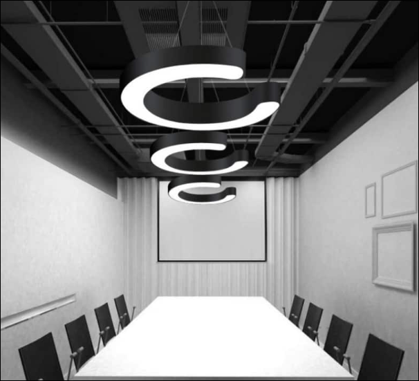Đèn thả chữ cái C, X, Y: Được mô phỏng theo các chữ cái nhằm sắp xếp tạo điểm nhấn cho không gian làm việc. Kích thước đường kình 600mm, cũng có nhiều tùy chọn ánh sáng theo nhu cầu của khách hàng.